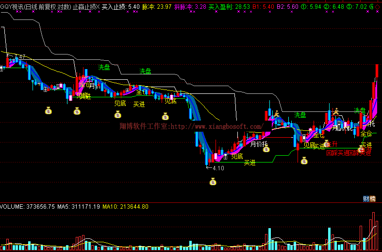 OPEN>REF(CLOSE,1),1,0),LOW*0.94,'买进') ,COLORYELLOW;