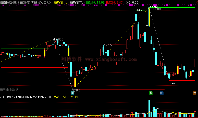 突破找顶主图的黄虚线是趋势向上线,白虚线是趋势向下线,反应了股票的基本走势。所谓“势”,指的是趋势和走势,不是定势和必然。红线是找底线(又叫地线),是前低点的水平延长线;绿线是找顶线(又叫天线),是前高点的水平延长线。找底线和找顶线的距离是前面阶段跌幅的三分之一以下,并且当日K线突破找顶线,有成交量增量和MACD两日在零轴线上面圆滑上升的配合,出买入信号(红箭头)。