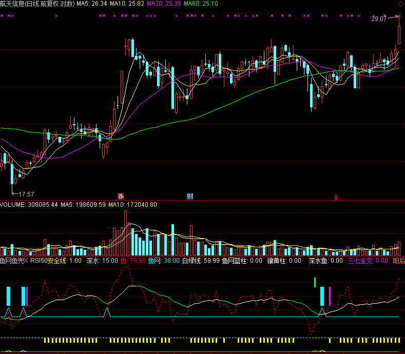 鱼网:IF((CROSS(RSI2,RSI4) OR CROSS(RSI2,A3) AND A3<好线 AND RSI1<平线),48,38),COLORFFFF00,LINETHICK1;
