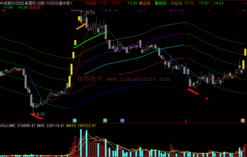 铁底线:IF(C<MA(C,60)*0.8,MA(C,60)*0.7,DRAWNULL),COLORRED,LINETHICK5;