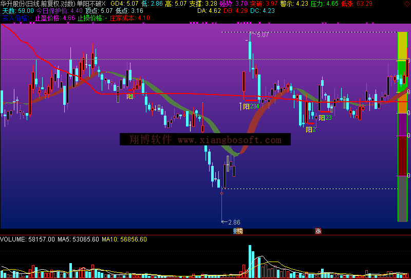 DRAWTEXT(BARSLAST(单阳)=4 AND 单阳不破,低不破价*0.98,'4'),COLORGREEN;