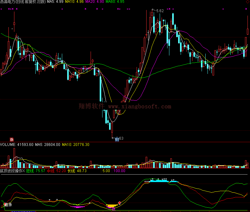 底:DRAWTEXT(CROSS(中线2,-90) AND (长线<中线 AND 长线>REF(长线,1)OR 短线<20 AND 中线<20 AND 长线<20),长线,'底'),COLORFF00FF;