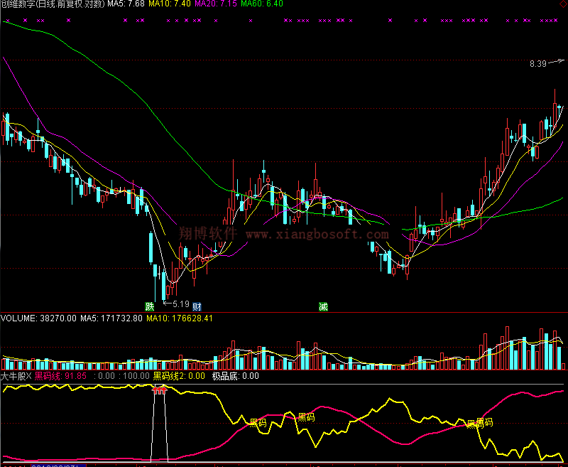 黑码线:EMA(VAR11,5), LINETHICK2,COLOR6600FF;