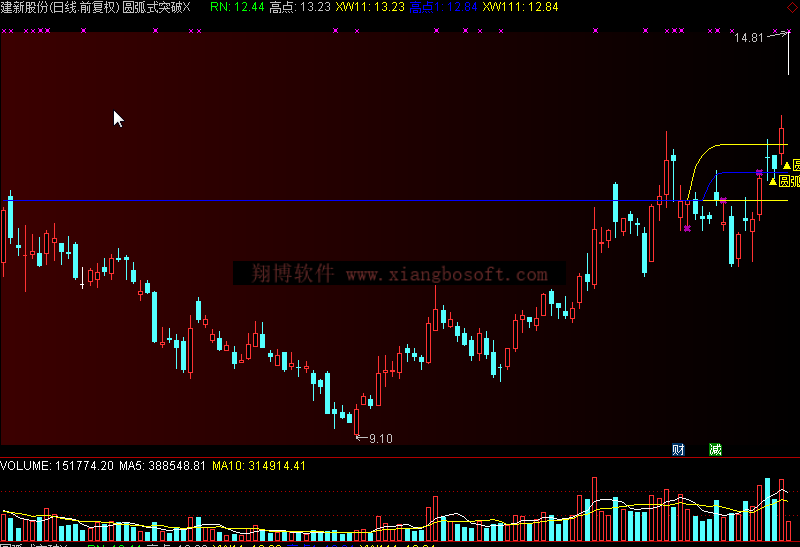 DRAWTEXT(CURRBARSCOUNT<10 AND XG ,L,'▲圆弧突破'),COLORYELLOW;