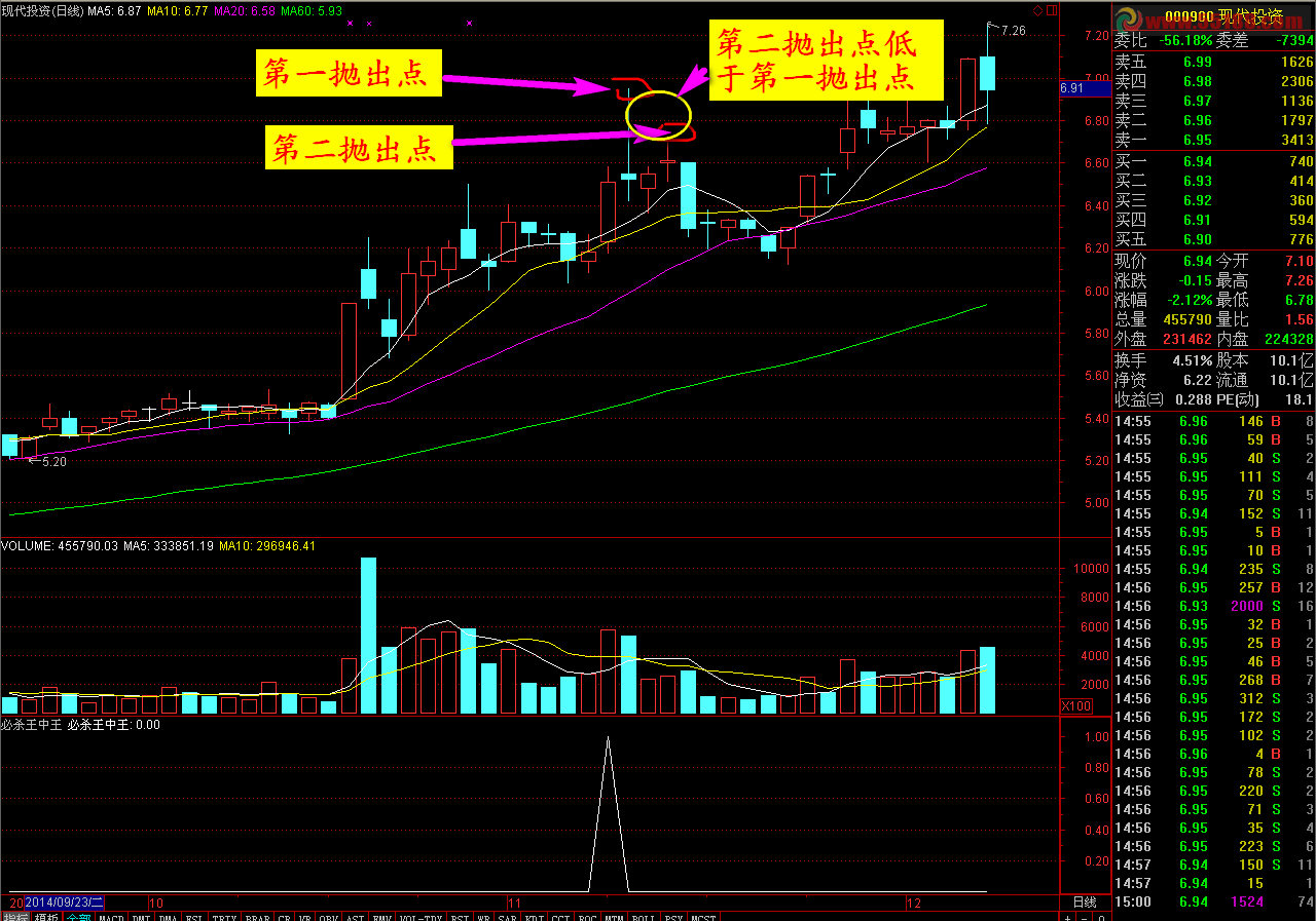 2,短线信号的出货点:结合盘中分时指标,短线的定义为3到8个点间,交易日定义为1到3个交易日,一般隔日冲高就出货。以000900为例来说,第二天冲高6个点。说明隔日获利达到5个点以上了,短线的思路是可以先抛一下了,当然如没有抛出,后面的两个交易日走势很明显,最高没有上冲到6.95元,所以此股只可暂时做短线。