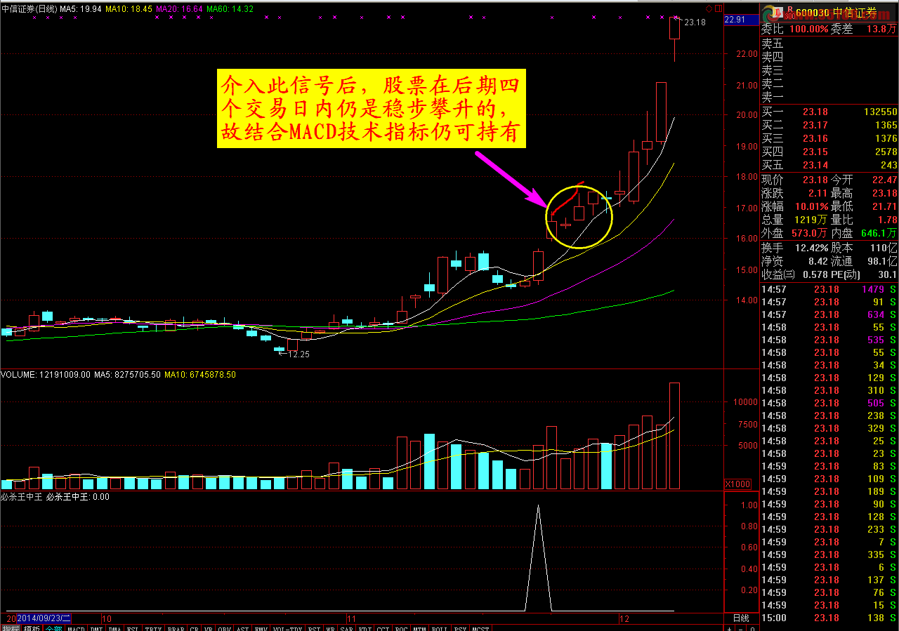 3,如何区别能持有做中线的信号,以600030为例来说,此股出信号后当然介入有获利,第二天高开高走,后面四个交易日都是不停的上攻,所以象这样的票,暂时可以持有做一下中线的。中线定义目标是25%左右,目标附近可自行抛出。