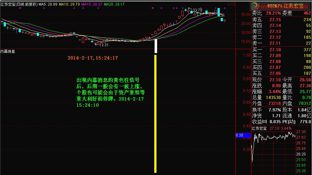 本指标是我所接触到的第一个采用软件来指明个股当天内幕消息的一个专业级指标,具有非常高的精准性和实用价值。只要有内幕消息的信号输出,后期要么是因为资产重组等重大利好而停牌,要么就是有不错的大幅上涨行情。