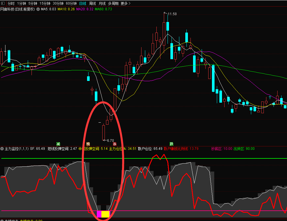 5,当红色曲线和白色曲线同时快速下降到下方的抄底区下方时,即表示散户在卖出,而且持有股票的大部分都没有赚钱,这时就是理想的抄底时机,当然是否抄底,和建仓的仓位还是根据个股的基本面和整个市场大环境综合决定。