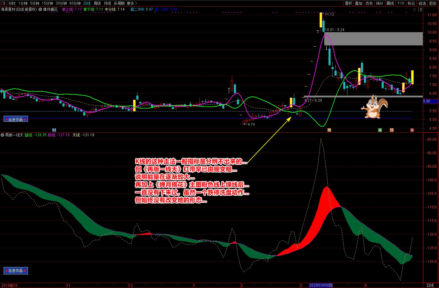 《婵月摘花》主图指标是为应和《再版一线天》应运而生的,在多数共振点上两图相互呼应,对确定个股的上升趋势和介入点起到了确认和甄别作用。主图的线条同样简洁明快,没有过多障眼的线条和文字显示,使图形看起来清爽神怡,特别是在关键点上的金叉信号真实可靠。在没有写出这两个指标前,有些个股的一些位置上,虽知道和大致确定她的趋势走向,但我还是不敢轻意决断是否再次介入或操作。但在去年11月写出这两个指标之后,感觉在一些个股的关键点上的再次介入和买卖变得轻松多了,并且成功的抓了几个波段小牛,如;603158腾龙股份(已卖出)、002246北化股份(已卖出)、002846英联股份(已卖出)、300485赛生药业 至今还在手上,这些个股在目前大盘趋势不是太好的情况下可以算是一个波段牛了。所以说,这两个指标只要应用的好,完全可以稳抓波段牛。只要拥有这套主副图指标足矣,再不需要其它指标辅助。
