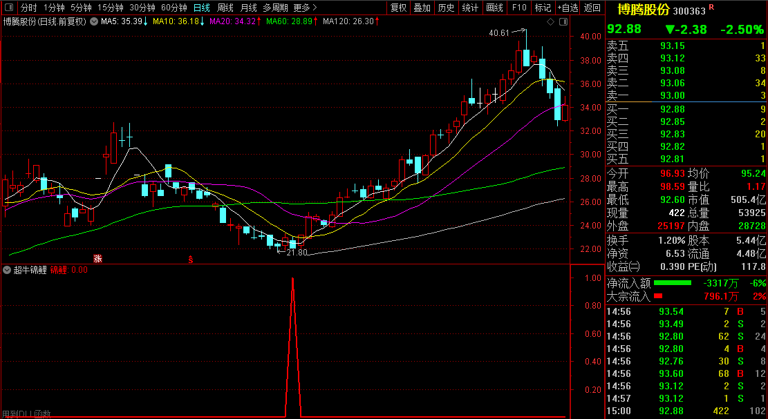 【超牛锦鲤】指标不含未来函数,大家放心使用。因为盘中行情在走,盘中信号消失属于正常现象,不属于未来函数,当天收盘之后信号若果成立,以后信号都不会有任何变化。所以盘中不需要开预警,临近收盘前5-10分钟再开,临近收盘3-5分钟信号不消失再介入,因为这时,信号基本确立了,介入点相对比较安全。指标已经根据最新行情进行最优化和测试,恕不接受额外其他周期的测评。