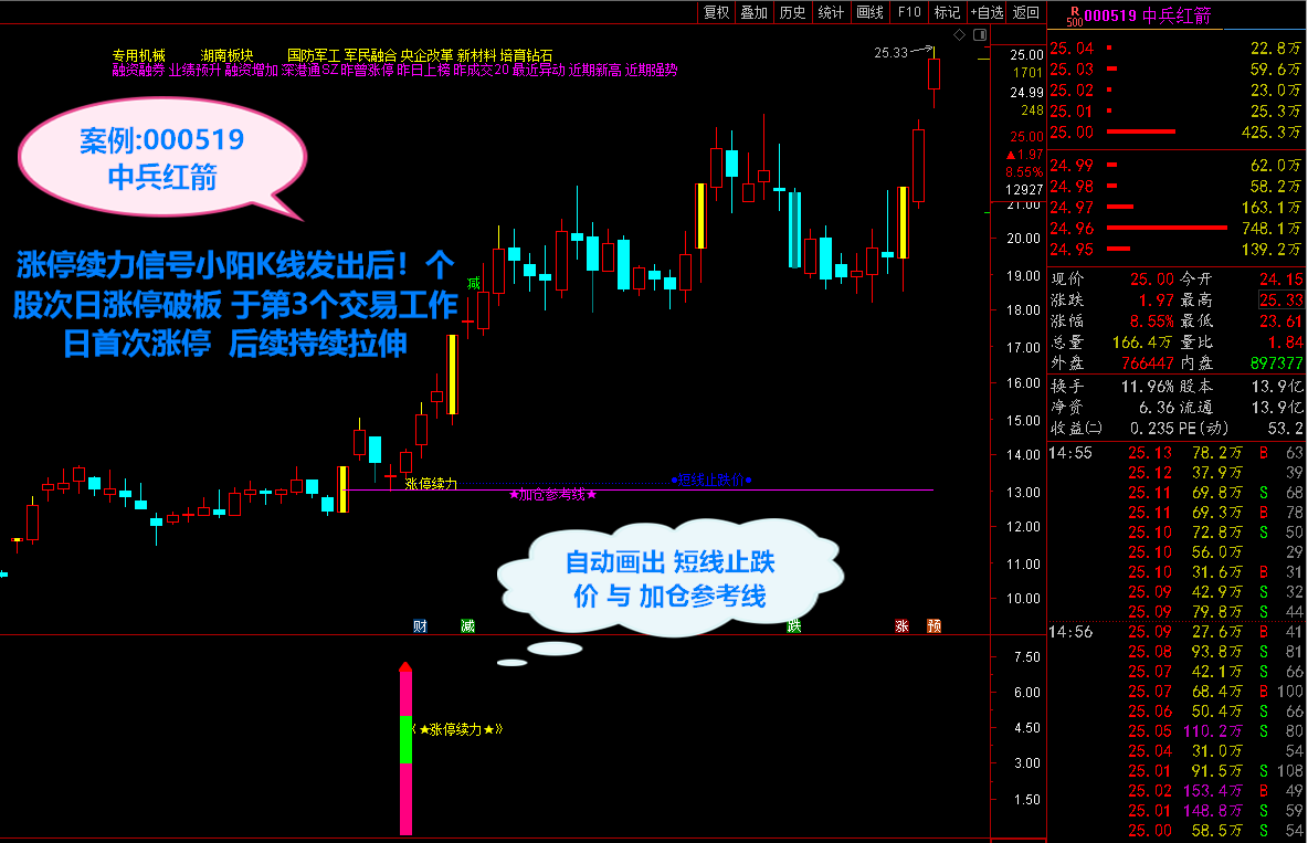功能介绍:此款指标设计思路是以主力涨停续力拉伸的角度进行开发编写 主要是体现出 捕捉主力符合条件信号后 自动捕捉主力的一个最佳涨停后的续力介入点 看着主力控盘意途跟着主力启动拉伸抬起股价 自信号当天发出后 自动设计画线 主力加仓参考价线 与 止跌参考价线 让实战操作者 进可攻 下可守 再也不用担心 个股走在哪进行止跌 与 个股跌破后 在哪寻找最佳参考补仓点烦恼