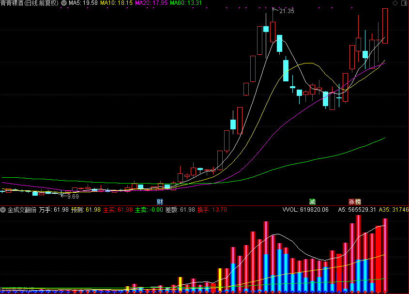 金成交翻倍,请留意红柱 万手:VOL/10000,LINETHICK0; AA:=IF(CURRBARSCOUNT=1 AND PERIOD=5,VOL*240/FROMOPEN,DRAWNULL); 预测:AA/10000; BB:=VOL/((HIGH-LOW)*2-ABS(CLOSE-OPE