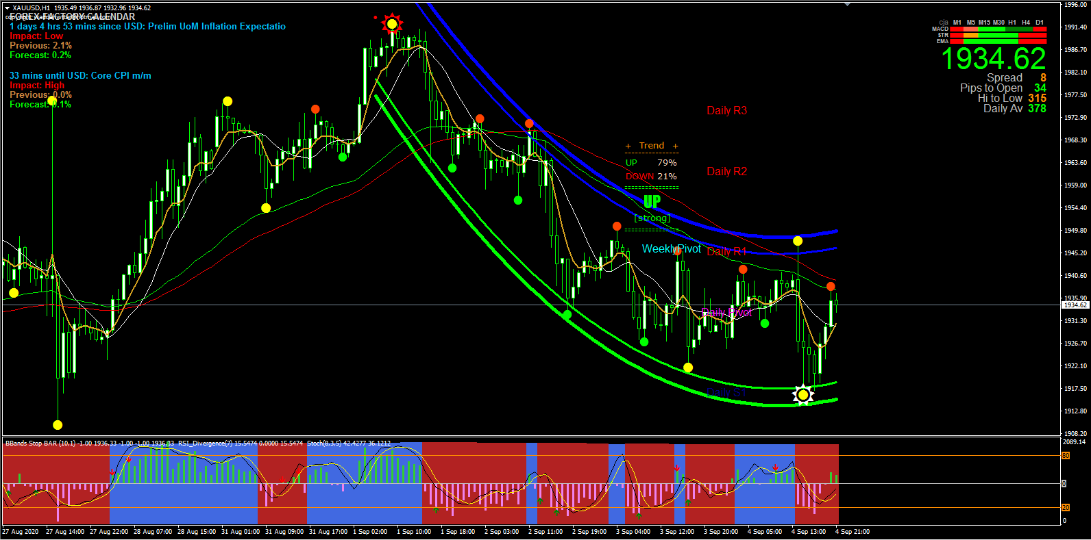 2.做空时机:当下方BBangs Stop BAR指标为蓝色和绿色柱上方出现红色箭头(如果绿色UP强度超过80%可忽视有无箭头),同时出现3级信号(黄色点加红色外框),趋势(Trend)显示为绿色(UP)超过70%,RSI(相对强弱指标)黄线和黑线在超买区(80以上)。