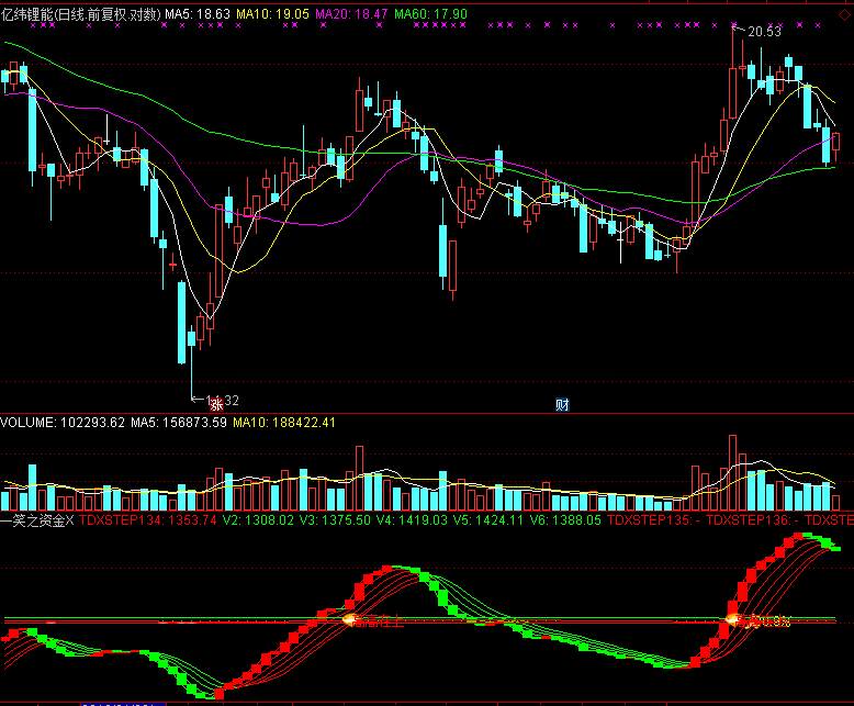 A23:=A18>=A19 AND A21=A20 AND A18>A22 AND CLOSE>A21 AND REF(A21,1)<REF(A20,1);