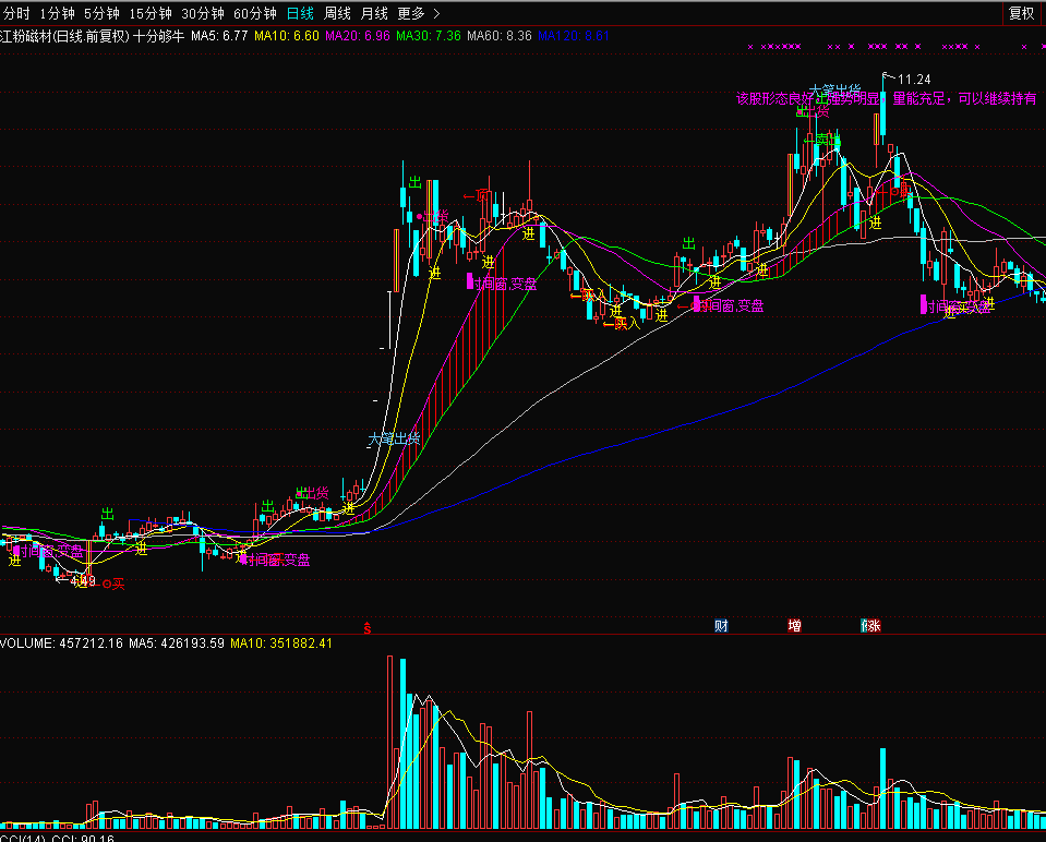 ,'上行趋势不变,强势依然,量能开始转弱,注意风险'),COLORFF00FF ;